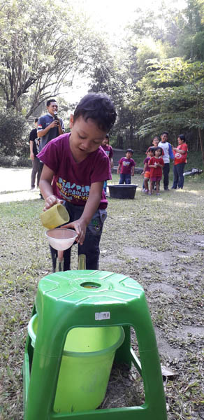 Permainan Pertamini adalah memindahkan air dari bak ember ke dalam botol menggunakan gelas yang berlubang. Supaya air yang dibawa tetap terkumpul banyak maka peserta dituntut untuk cepat lari menuju botol permainan. Hal ini dilakukan secara bergantian antar anggota kelompok dengan bertujuan peserta untuk terbiasa antri dan melatih peserta untuk bersama-sama maju menuju ke satu tujuan. Dalam hal ini mengumpulkan air sebanyak mungkin supaya kelompoknya bisa menang karena setiap anggota kelompok sekecil apapun tetap berkontribusi dalam kelompok.