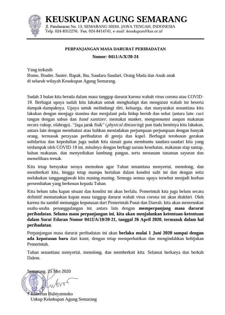 Perpanjangan masa darurat peribadatan ini akan berlaku mulai 1 Juni 2020 sampai dengan ada keputusan baru dari kami, dengan tetap memperhatikan dan mengindahkan kebijakan Pemerintah.